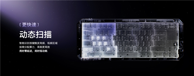 为了保证一主多从架构下算力和电力的合理分配,“源点星链”方案创新推出动态扫描技术,将键盘划分了独立的管理区域和芯片后,通过算法智能的识别每个区域的活跃度。比如玩家玩游戏时,键盘会智能识别并快速适应学习你的使用区域。对应的分区会立即自动开启“电竞模式”,将算力和电力优先供给此区域,从而让延迟,精度,稳定性都达到极致。