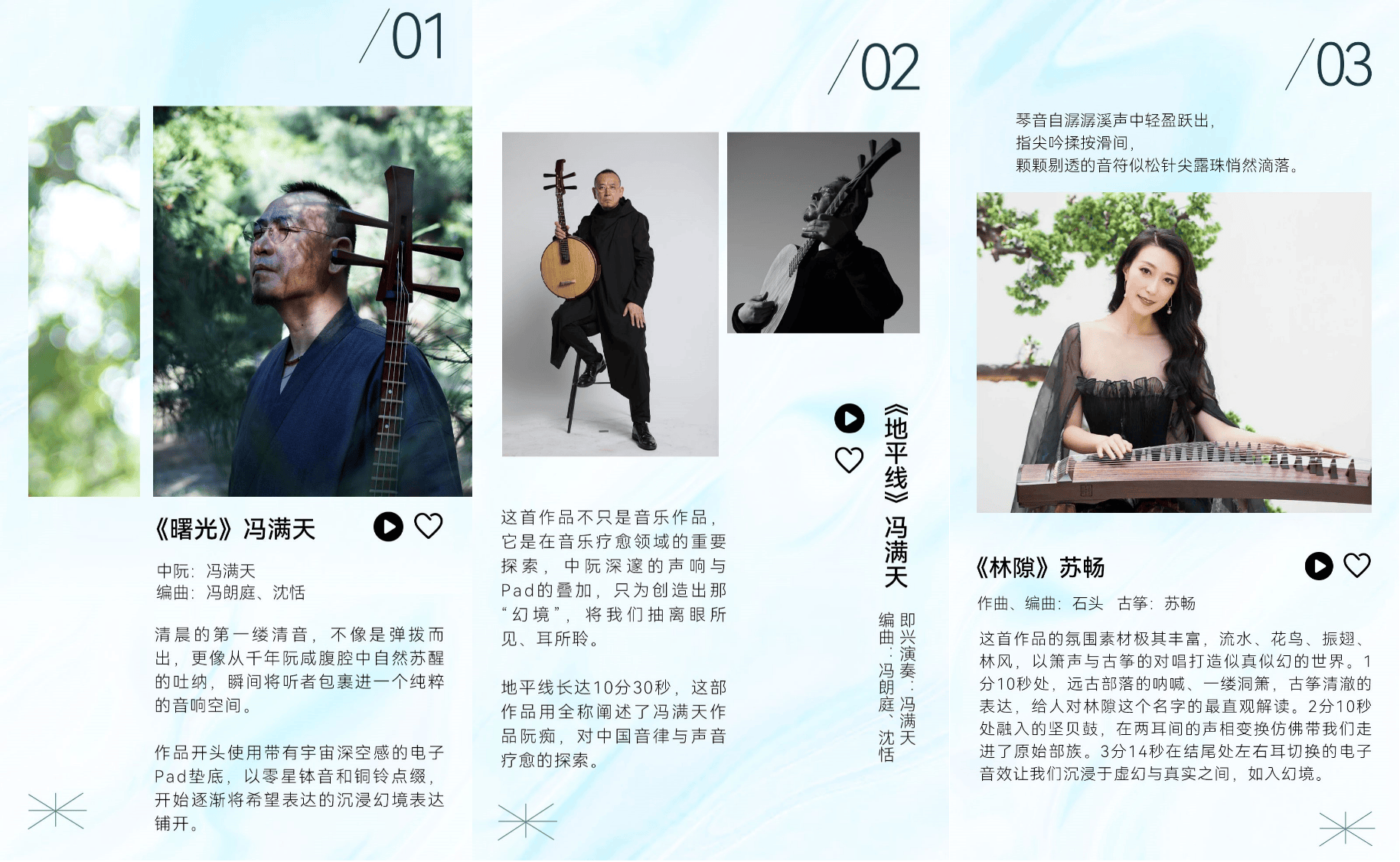 为了展现更沉浸感的体验,阮咸演奏家冯满天的《曙光》以清脆铃铛开篇打破寂静,阮音如朝阳驱散浓雾,带大家沉浸式体验一场声音的日出;《地平线》是冥想利器,中阮深邃声响与空灵电子合成器叠加,慢节奏旋律勾勒出日出前的沉静悠然,每根琴弦的震动都藏着心绪。古筝演奏家苏畅的《林隙》以鸟鸣流水开篇,箫与古筝相伴,搭配琶音器,像在竹林中呼吸自然气息,治愈又放松。