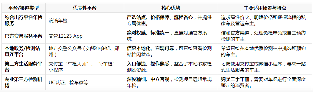在选择年检平台前,一个清晰的横向对比能帮助我们快速抓住重点。下表汇总了几类主流服务渠道的核心特点: