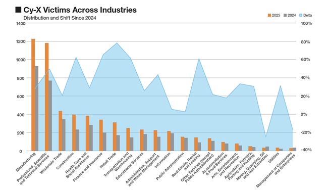 报告指出,网络勒索(Cy-X)在全球范围内呈现爆炸式增长,自2020年以来受害者数量已增至三倍,受影响组织超过1.9万个。中小型企业成为攻击的主要目标,在受影响企业中占比达三分之二,且在供应链攻击中扮演关键角色。一些关键行业受影响尤为严重,其中金融保险行业受影响组织数量增长 71%,医疗行业增长 69%,交通运输和仓储行业增长67%。