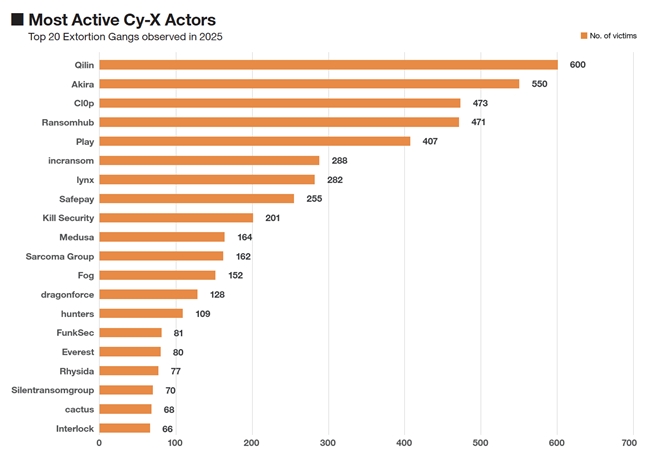 网络犯罪正日益专业化与产业化,其依托“犯罪即服务”(CaaS)模式,并逐步融合人工智能技术,攻击手段不断升级。与此同时,网络空间的碎片化趋势加剧,犯罪组织更迭频繁,活跃恶意行为者数量大幅增加。LockBit、Black Basta等大型犯罪集团解散后,众多规模相当的新参与者纷纷涌现。活跃恶意行为者名单几乎增至三倍,从 33 个增至 89 个。