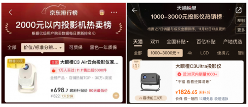 据洛图科技最新数据显示,2025年双11大促期间,1LCD市场的品牌集中度提升明显,销额前四的品牌为大眼橙、小米、哈趣和天猫魔屏,合计份额为50%。其中,大眼橙凭借600元档的C3 Air和千元旗舰机型C3 Ultra的优异表现跃居1LCD线上市场首位,成为百元、千元档入门级投影仪的的不二之选。