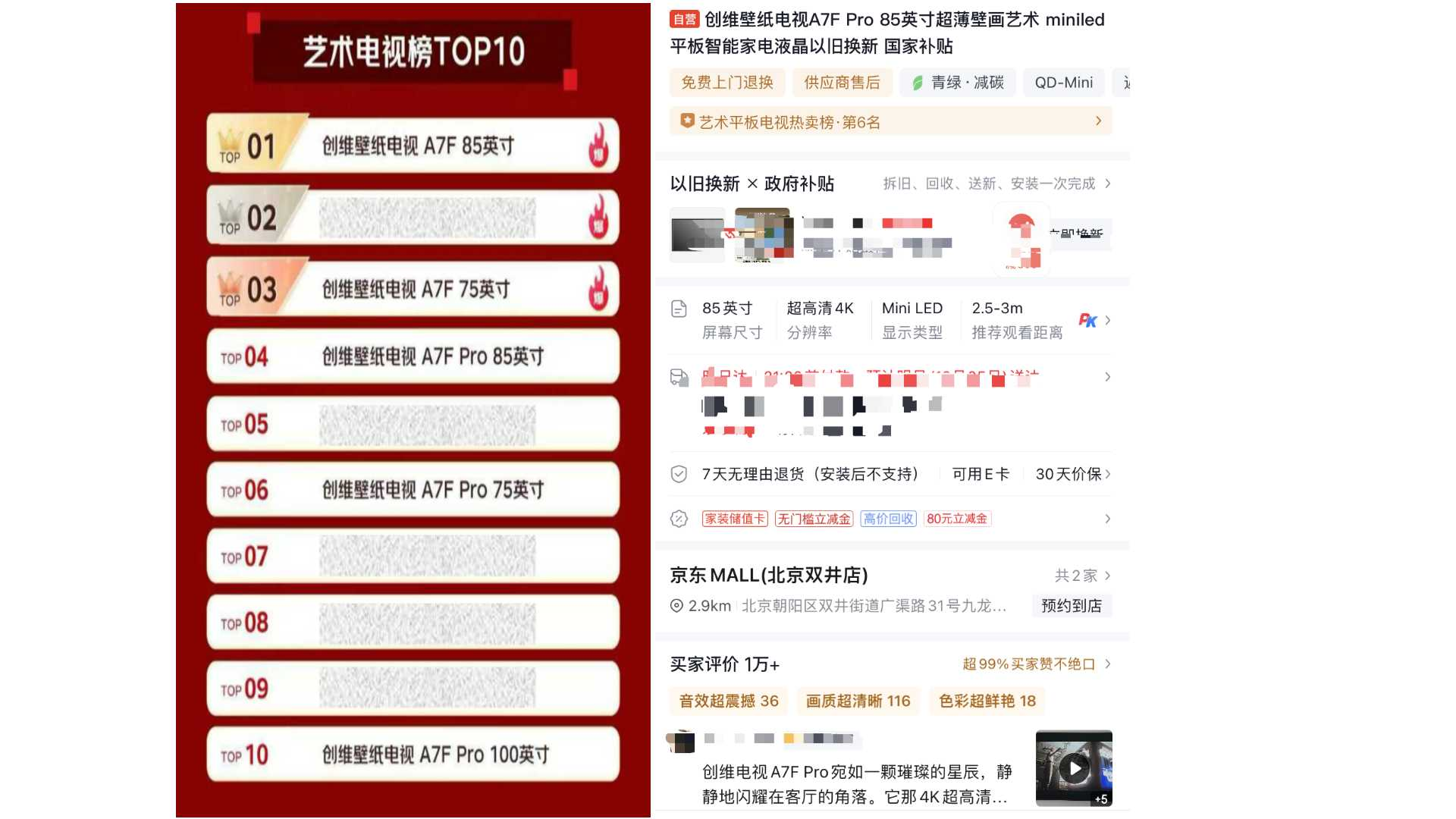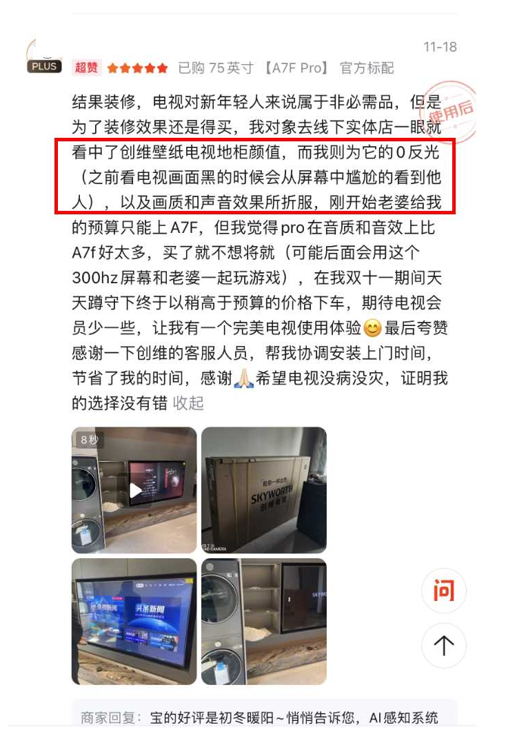 在此趋势下,创维壁纸电视A7F Pro凭借独特的壁纸美学设计,迅速成为高端家装与影音爱好者的焦点。双11霸榜、超万条好评、京东自营店铺好评率100%,不仅证明了产品硬实力,更标志着“美学即刚需”已成为高端消费的新共识。