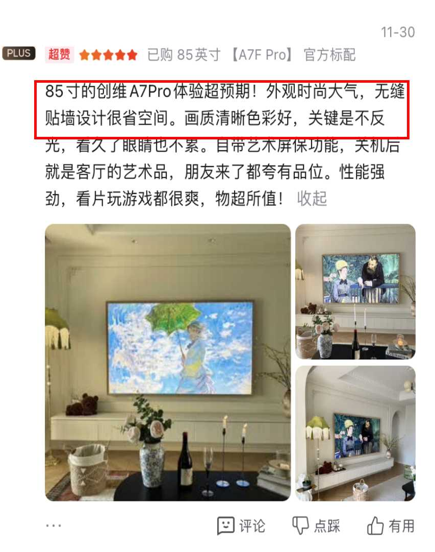 在超万条评论中,“超薄无缝贴墙”、“哑光屏白天0反光”、“会动的油画”、“客厅艺术品”等成为代表“颜值美”的高频关键词。这些口碑验证,创维壁纸电视正成为塑造家居美学不可或缺的核心元素。