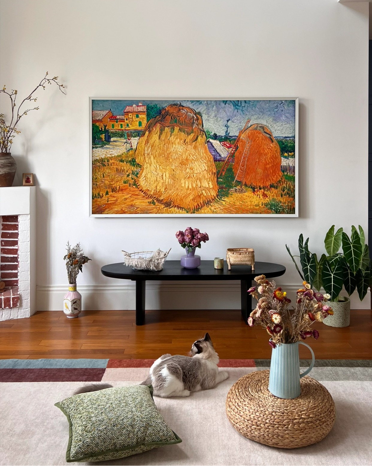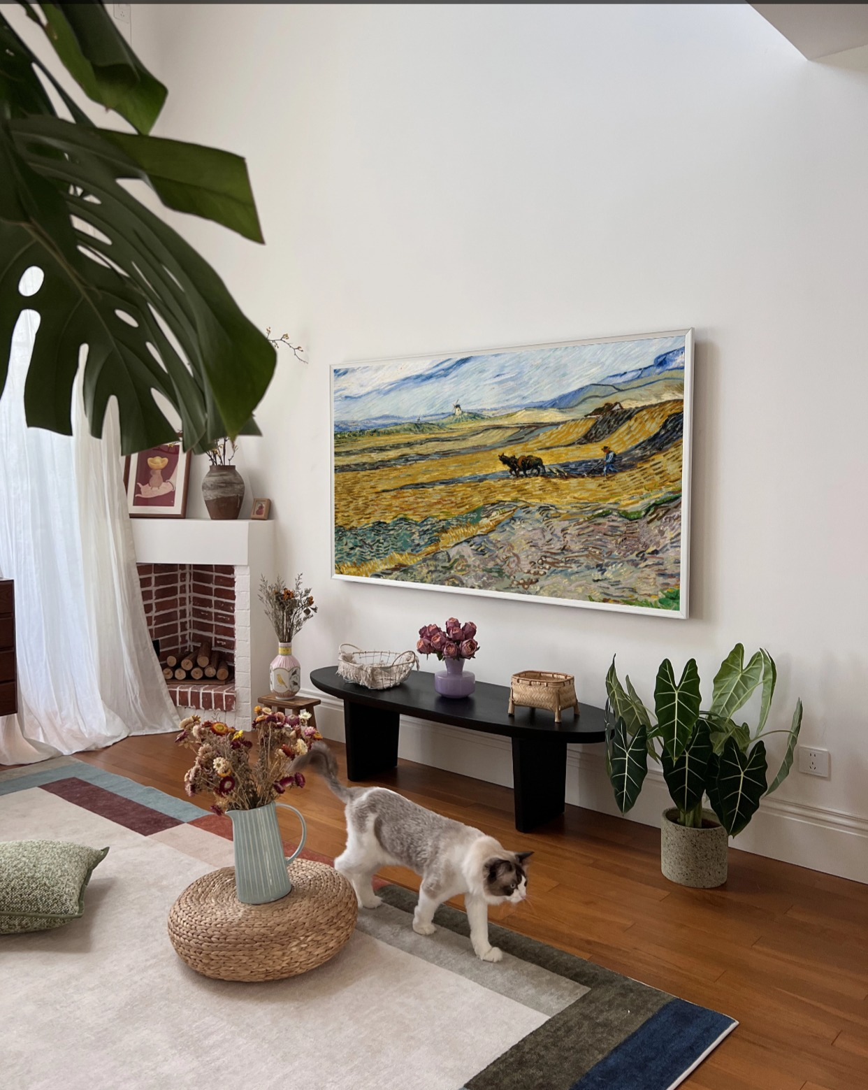 浅胡桃木色的温润、雪山白色的纯粹与棕色的沉稳,精准匹配从复古到现代的不同家装色调,从视觉上强化了“画作”的实体感。当世界名画显示于其中时,壁纸电视化身为一件和谐融入客厅的背景装饰,用精巧的设计为空间美学默默加分。