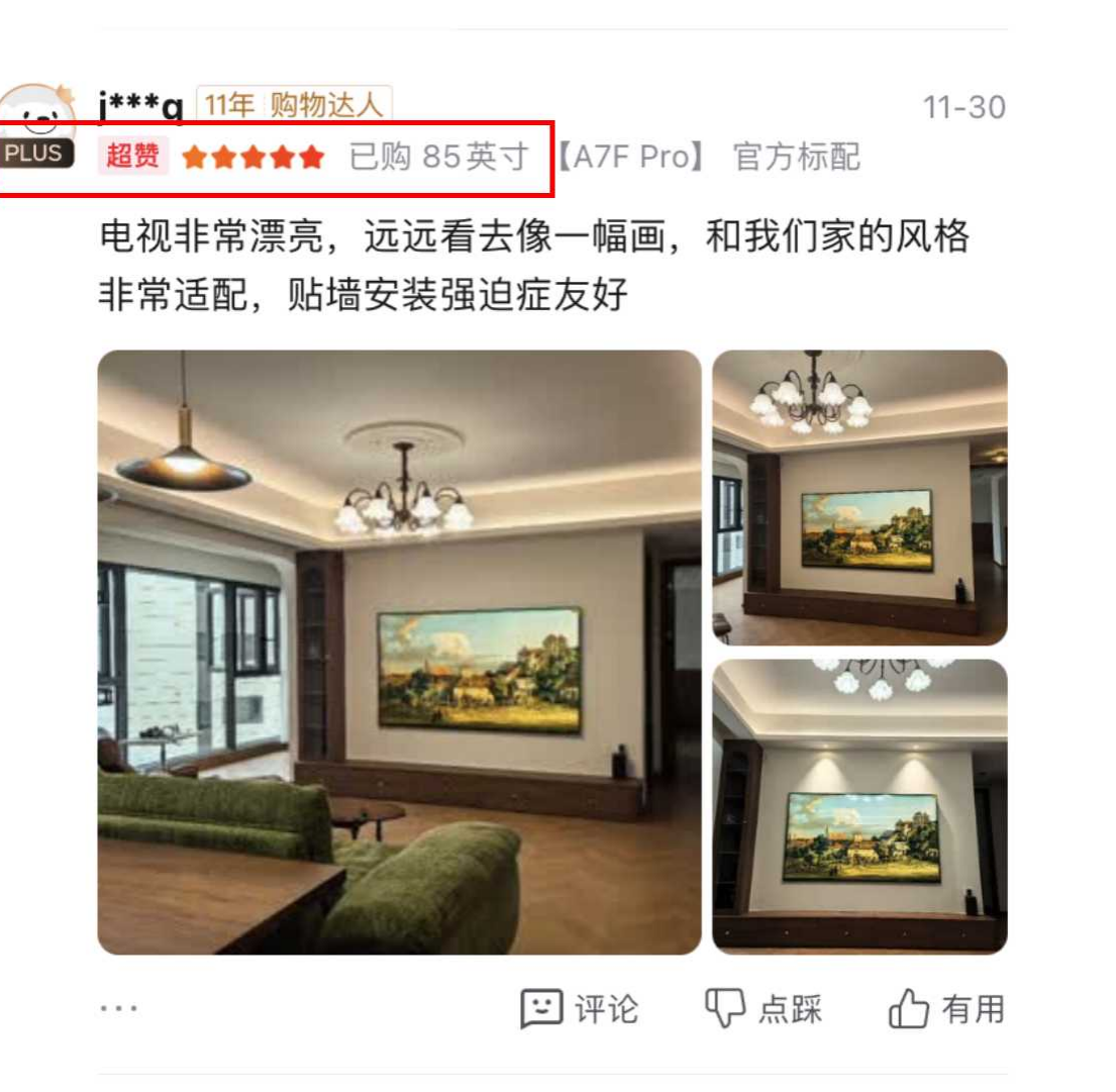 无论是宋式美学大平层的禅意空间,还是意式风格的奢华居所,亦或是中古风小别墅的复古情怀,创维A7F Pro都能恰到好处的融入其中,成为提升整体空间质感的关键元素。“一机适配百种家”,让用户由衷评价其“与家庭风格很搭”“融入家装风格”“背景墙和谐”。