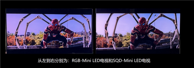 相比之下,SQD-Mini LED只是提高了基础色域,只控光不控色,主打高亮度,但亮度不稳定,控光能力不及RGB-Mini LED。比如播放HDR高亮视频,如《蜘蛛侠》,SQD-Mini LED屏幕亮度会突降,不及参数分区更低的RGB-Mini LED电视,细节上,蜘蛛侠腰带部分细节消失,身后房子黑成一片。原因是因为SQD-Mini LED电视为防止过亮过热产生的保护措施。