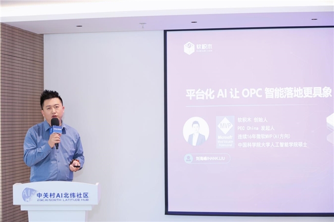 活动中,中关村AI北纬社区为软积木、开源社、鲸选AI等首批人工智能OPC友好社区生态伙伴授牌。中国科学院大学校友企业、微软AI方向全球最有价值专家(MVP)、PEC China发起人、中关村AI北纬社区入驻企业软积木创始人刘海峰,作为生态伙伴代表,以《平台化AI让OPC智能落地更具象》为题分享了实战经验。他结合实际运营经验指出,平台化 AI 正在为OPC创业者以及各类科技园区注入新的增长动能。依托多引擎、多模态的能力底座,OPC创业者得以大幅降低技术门槛,以更低成本、更高效率完成智能化升级。对于科技园区而言,这种可复制、可规模化的 AI 能力供给,不仅提升了园区的创新产出与项目落地速度,也让更多OPC创业者能够真正把 AI 做成成果,进而形成可持续的智能产业集聚效应。