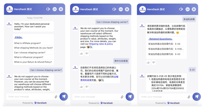 关于“我的货到哪了?”“怎么安装?”“怎么保修?”“如何退货?”……这些标准化问题,HeroDash的AI客服(Chat / Voice)能瞬间响应,准确解答,大幅降低响应时长,提升顾客满意度。