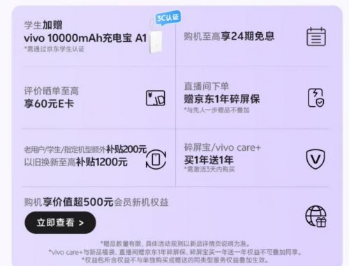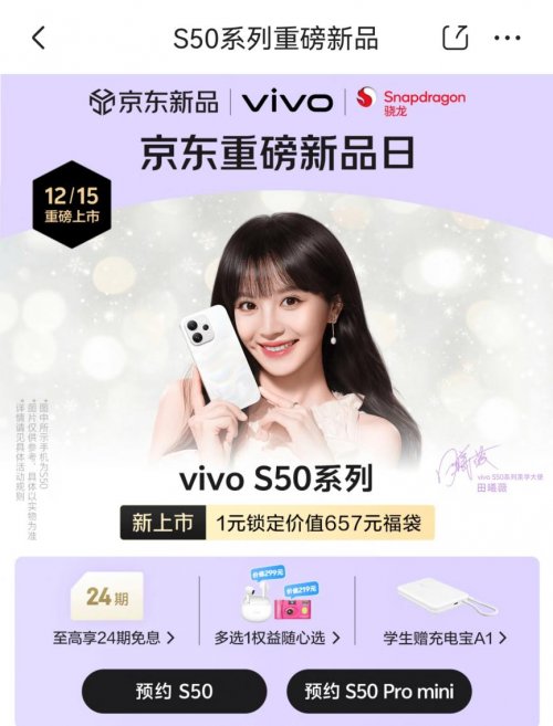 来京东预约vivo S50系列,可1元锁定价值657元新品福袋,福袋包含3年电池宝、1年延保和1年进水宝,店铺会员或京东PLUS会员或学生仅需0.01元即可锁定该福袋。此外,来京东下单vivo S50系列还可享至高24期免息、以旧换新至高补贴1200元、学生加赠vivo 10000mAh充电宝A1、直播间下单赠京东1年碎屏保、评价晒单至高享60元E卡、碎屏宝/vivo care+买1年送1年、价值超500元会员新机权益等福利。