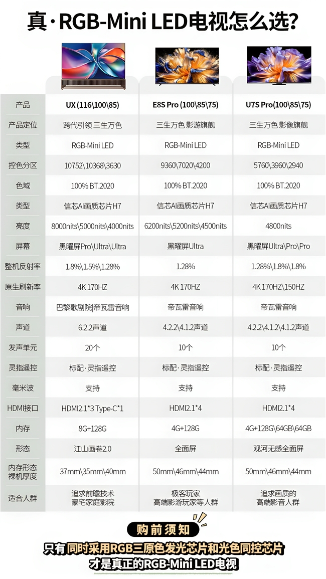 结语:海信凭借领先行业的RGB-Mini LED技术开启了高端电视的新蓝海市场。同时需要警惕的是,市面上有一款假RGB-Mini LED电视Q9M,利用万元以内低价的噱头误导消费者,实际上采用“BG-MiniLED+红色荧光粉”的显示方案。想要体验高端影音氛围的消费者切记,真正的RGB-Mini LED是高端技术,目前价格都在万元以上,万元以下假货多。只有同时采用RGB三原色发光芯片和光色同控芯片,才是真正的RGB-Mini LED。买RGB-Mini LED电视首选海信。