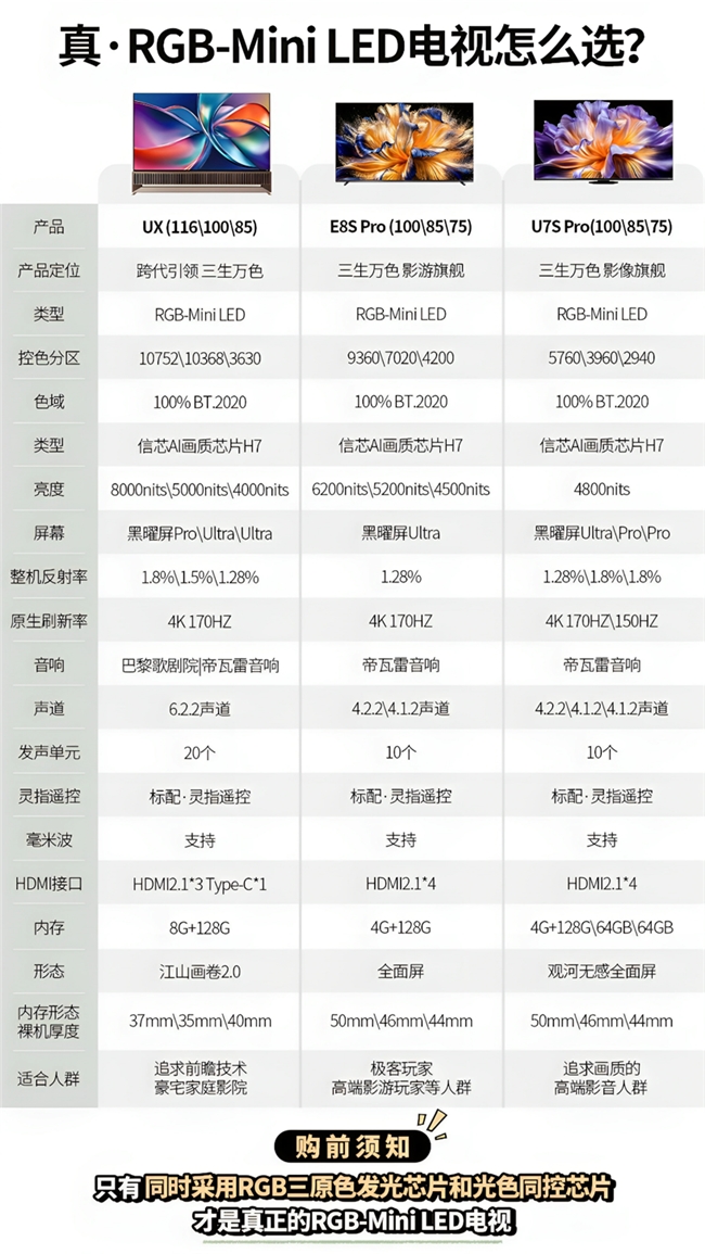 在这种背景下,高端电视用户选购RGB-MiniLED首选海信。目前,海信在售的RGB-MiniLED机型包括UX、E8S Pro、U7S Pro三大系列,均采用RGB三原色LED芯片和全球首发光色同控信芯AI画质芯片H7,支持行业量产最高3 x 10240分区控光和行业最高108bits控色精度,可实现100% BT.2020超高色域,较QD-OLED提升9%,较QD-Mini LED提升19%。而三大旗舰系列也可精准满足消费者从豪宅顶配到影游发烧,再到品质生活刚需的高端场景需求,成为新一代高端电视的标杆之作。
