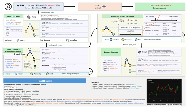 金融决策需要处理海量实时信息,同时理解其复杂的时间关联。传统搜索引擎虽擅长提供实时信息访问,却往往难以解读精细的用户意图和上下文细节。相反,大语言模型(LLMs)虽展现出推理与交互能力,但若无法获取即时数据则可能生成不可靠的输出。尽管近期有研究尝试将LLMs与搜索能力结合,但这些方案存在三大局限:(1)专业金融数据获取受限;(2)静态查询结构无法适应动态市场变化;(3)结果生成缺乏时序感知能力。
