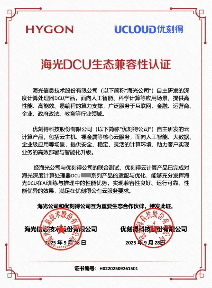 在此前合作中,优刻得已与海光信息正式达成重要生态伙伴认证。经双方联合测试与验证,优刻得已完成对海光深度计算处理器DCU系列产品的适配与优化,能够充分发挥海光DCU在AI训练与推理场景下的性能优势,实现良好的兼容性、稳定性与可靠性,整体性能表现优异,满足优刻得公有云服务的相关技术与运营要求。