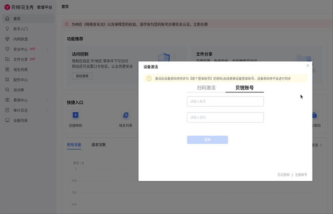 使用刚刚生成的SN码和密码登录。首次登录需要进行设备激活,可以选择扫码激活或使用贝锐账号激活,流程比较简单。