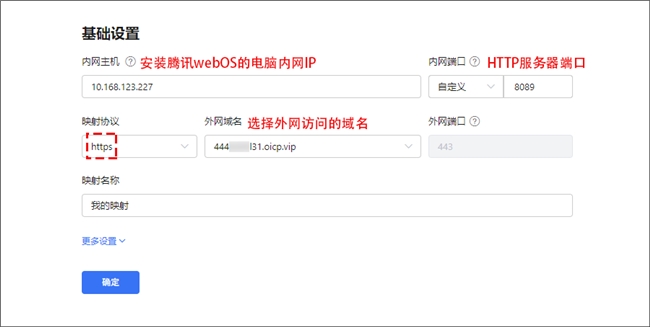 设备激活完成后,就可以开始配置内网穿透映射。在管理后台中新增一个映射规则,将内网IP指向WebOS所在主机,内网端口填写刚才使用的8089端口,映射类型选择HTTP或HTTPS即可。