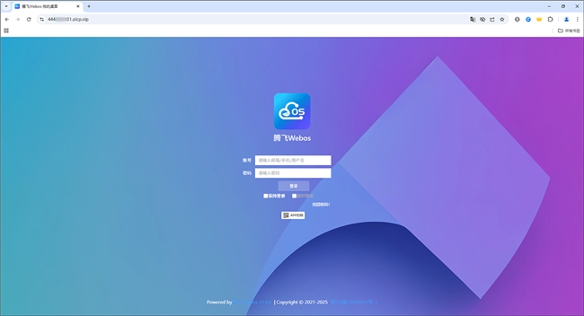 当映射生效后,无论你身处什么网络环境,只需要在浏览器中输入花生壳生成的公网地址,就可以直接访问腾飞WebOS的登录页面。