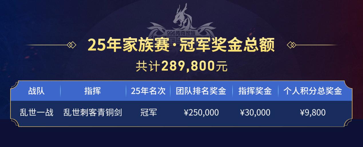 996传奇家族全国争霸赛在经过13天、13场共计29轮的激烈角逐后,也已经在12月17日圆满落幕,入围的16支家族队伍几乎都是全国范围内的顶尖劲旅,其中既有发展历程近20年的老牌“世家”,也有精锐和新秀组合起来的新血团队。最终,“乱世一战”和“网通明星队”两支队伍披荆斩棘,在总决赛上演巅峰对决,“乱世一战”取得了最后的胜利,夺下冠军奖杯,并收获了总计289800元的奖金(团队排名奖金250000元、指挥奖金30000元、个人积分奖金9800元)。