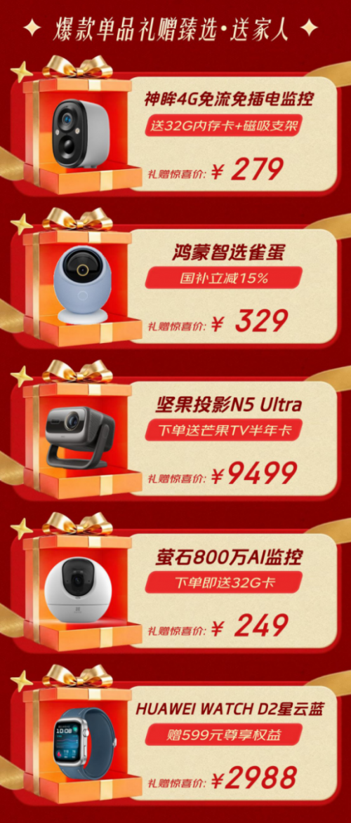 无论你想送给谁,这里都有贴心的推荐。为家人选择礼物,重点是实用与关怀。神眸4G免流插电监控,赠送32G内存卡与支架,279元让关怀随时在线;鸿蒙智选摄像头享国补立减15%,329元智享安全;坚果N5 Ultra投影仪下单送芒果TV半年卡,9499元让共享家庭观影之乐;萤石800万AI监控赠32G卡,礼赠惊喜价249元,还有HUAWEI WATCH D2星云蓝智能手表,赠599元尊享权益,礼赠惊喜价2988元,守护着家人的安全与健康。