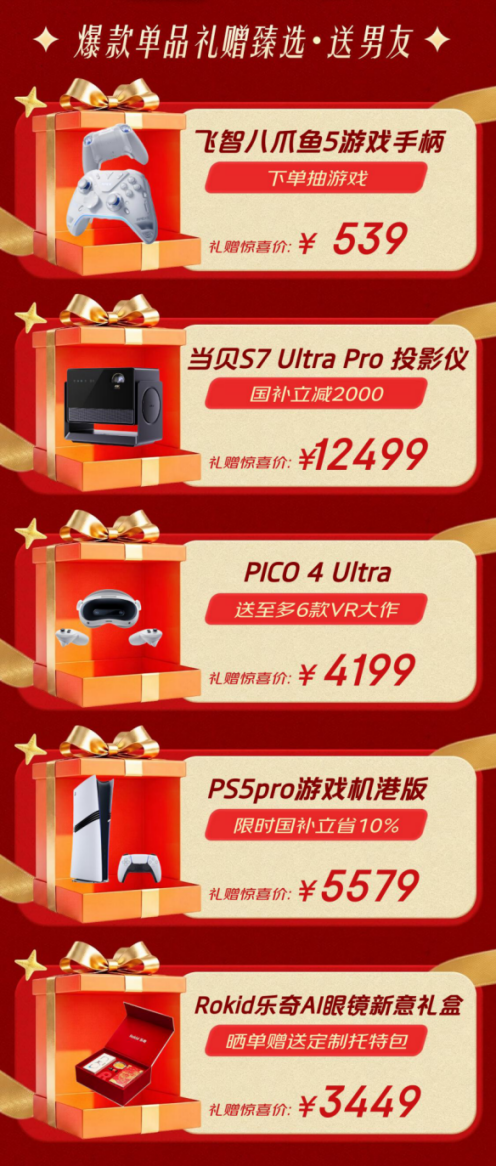为男友挑选礼物,可以关注那些能点燃他激情的科技潮品。专为硬核玩家打造的飞智八爪鱼5游戏手柄,下单即享抽游戏福利,惊喜价仅539元;若想打造沉浸式家庭影院,当贝S7 Ultra Pro投影仪享国家补贴立减2000元,12499元即可入手;追求前沿体验,PICO 4 Ultra VR一体机赠送多达6款VR大作,4199元带来虚拟世界的震撼;备受期待的PS5 Pro游戏机港版限时省10%,5579元圆梦次世代主机;还有潮流与科技感兼备的Rokid乐奇AI眼镜新意礼盒,晒单还送定制托特包,心意价3449元。