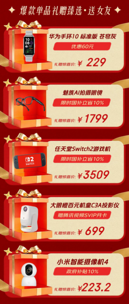 送给女友的礼物,则要兼顾颜值与巧思。轻盈时尚的华为手环10标准版苍穹灰直降60元,惊喜价229元;魅族AI拍摄眼镜让她随时记录第一视角的精彩,限时补贴省10%,1799元轻松拥有;共同畅玩乐趣的任天堂Switch2游戏机同样享10%补贴,3509元开启游戏时光;千元价位投影仪中的佼佼者大眼橙C3A,赠腾讯视频SVIP月卡,仅699元就能提升居家幸福感;还有小米智能摄像机4,政府补贴10%后223.2元,为小家添一份智能安防。