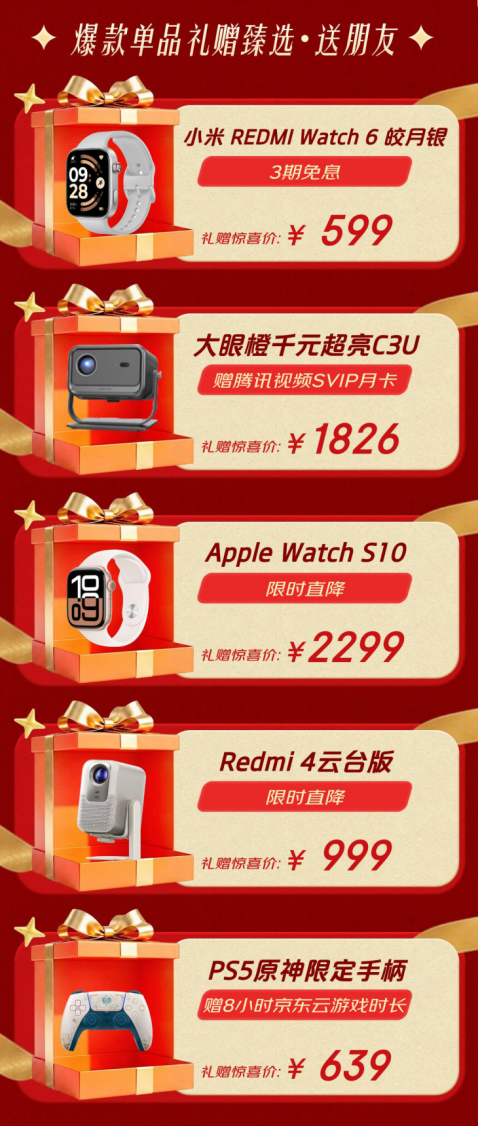 赠予朋友的礼物,讲究的是投其所好与品质之选。小米Redmi Watch 6皎月银支持3期免息,599元呈现精致腕间科技;大眼橙千元级高亮投影C3U赠腾讯视频SVIP月卡,惊喜价1826元,是性价比之选;Apple Watch S10限时直降至2299元,经典永不过时;Redmi智能摄像机4云台版限时特价999元;PS5原神限定手柄赠8小时京东云游戏时长,639元助力游戏征程。