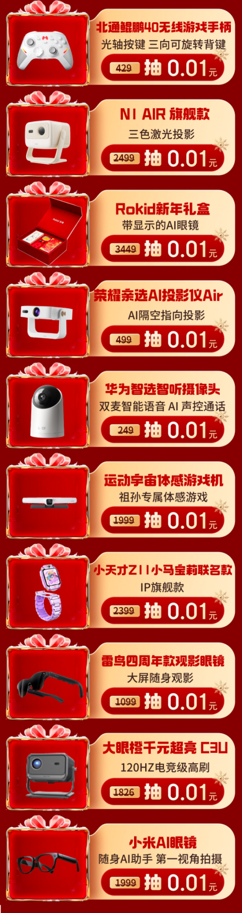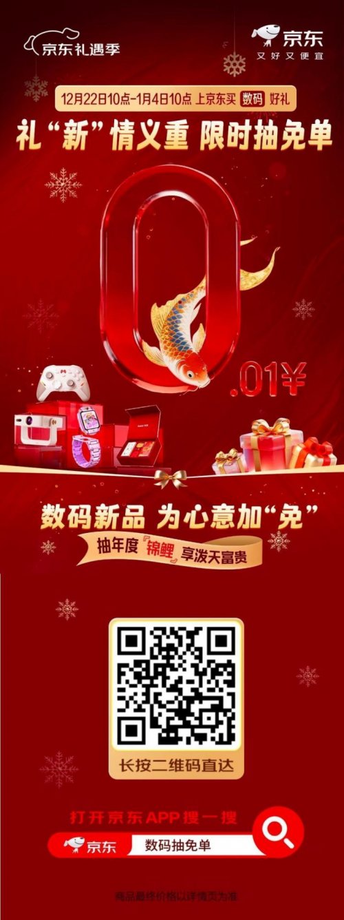 更令人心动的是,京东潮玩数码礼遇季还特别推出了“限时抽免单”活动。即日起至1月4日10点,打开京东APP搜索“数码抽免单”,即有机会以0.01元带走众多热门数码新品。