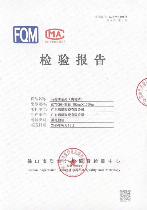 玛缇瓷砖马毛系列产品,不仅通过 2025 年 12 月起实施的陶瓷砖新国标认证,更以 0.03% 的超低吸水率,远超优质瓷砖标准,尽显高端品质硬实力。
