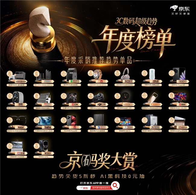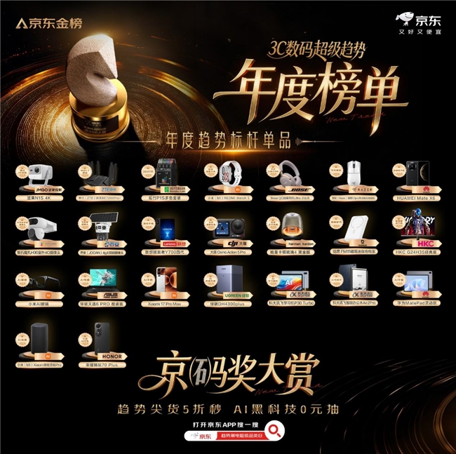 12月24日,京东重磅发布“京码奖大赏·3C数码超级趋势年度榜单”,基于京东金榜海量消费反馈与专业洞察,围绕AI进阶、居家娱乐、户外轻享、智慧起居、创意智造与智能穿戴六大年度趋势场景,甄选出备受用户喜爱与行业认可的趋势好物与品牌。即日起,打开京东APP搜索“趋势潮电”,即可进入“3C数码趋势潮电超级品类日”会场,享趋势尖货5折秒杀、AI装备0元抽等福利,众多上榜趋势爆品同步开启限时秒杀,助你轻松入手心仪潮电。