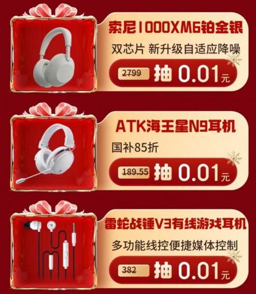无论是在喧嚣通勤中寻求宁静,还是在游戏世界里听声辨位,本次活动中均有对应产品满足不同人群的音频焕新需求。索尼1000XM6铂金银头戴式耳机,新一代双芯驱动,搭载HD降噪处理器QN3和12颗高性能降噪麦克风,可以自适应场景降噪优化,原价2799元;ATK海王星N9耳机,拥有旗舰机Hi-Fi音质和电竞级听声辨位,重新定义游戏耳机音质高标准,叠加国补85折后到手价189.55元;雷蛇战锤V3有线游戏耳机拥有逼真的沉浸式声场和多功能线控,可以实现轻松便捷的媒体控制,原价382元。三款实力耳机皆可参与0.01元抽奖。