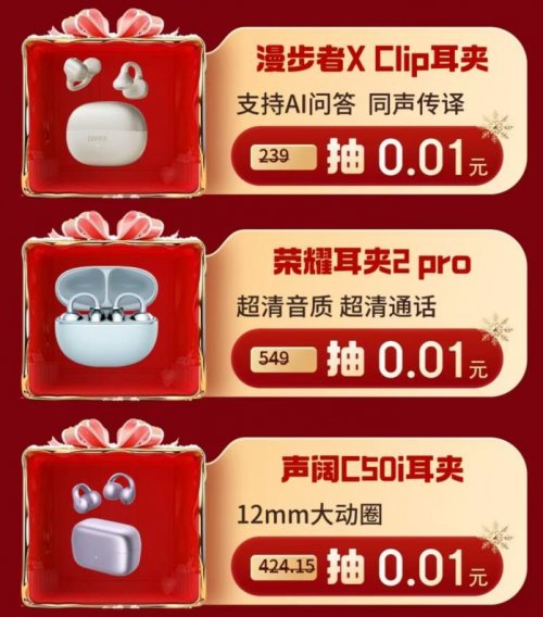 如果更青睐舒适贴耳的佩戴感,以下几款耳夹式耳机同样值得关注:漫步者X Clip耳夹接入豆包、DeepSeek双模型协作,支持AI问答,同声传译,原价239元;荣耀耳夹2 pro采用舒适钛拱桥2.0,自适应多种耳型,佩戴舒适,同时拥有超清音质和超清通话,原价549元;声阔C50i耳夹搭载12mm高保真动圈单元,带来前所未有的惊艳音质,原价424.15元。这些兼具舒适与智能的耳夹产品,均有机会通过0.01元抽奖入手。