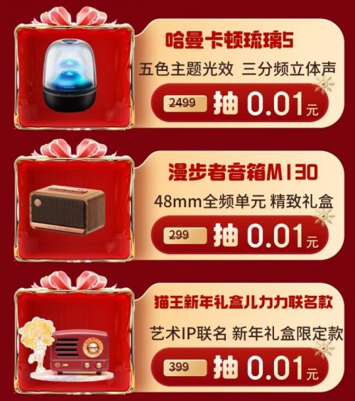 除了实用的耳机、耳夹等穿戴音频好物,氛围感拉满的质感音箱新品也同步加入0.01元抽免单活动。哈曼卡顿琉璃5代拥有5色主题光效和三分频独立高中低音,营造全感官的沉浸体验,原价2499元;漫步者音箱M130拥有48mm全频单元,声效动人心弦,还配备精致礼盒包装,送礼更省心,原价299元;猫王新年礼盒儿力力联名款音响,联名艺术家儿力力的IP“白日梦小姐fluffy lili”,新年礼盒限定款点亮新年氛围,原价399元。三款风格各异的音箱,皆可参与抽奖以0.01元入手。