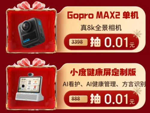 此外,活动还涵盖了专业影像创作与智能健康产品。Gopro MAX2单机全景运动相机升级真8K全景拍摄,支持10-Bit色深,能记录10.7亿种色彩,还有地平线锁定的超强防抖功能;小度健康屏定制版智能屏音响,专为长辈设计,具备AI看护、AI健康管理和方言识别功能,给长辈24小时的健康关怀。两款产品原价分别为3398元与888元,现同样开放0.01元抽奖通道。
