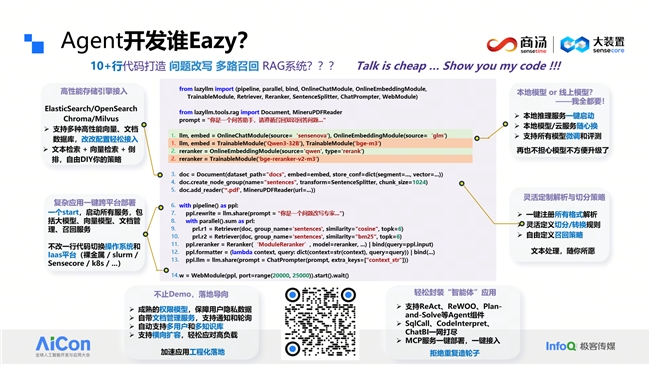 王志宏特别介绍了,支撑这一体系的,是商汤自研Agent 应用开发框架 LazyLLM,能够以极低成本构建强大Agent系统,并解决私有化与复杂生产环境中的关键难题。