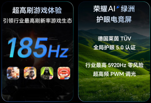 荣耀WIN RT搭载6.83英寸超清大屏,支持6000nits最高峰值亮度、1nit硬件极暗模式、AI臻彩显示2.0、AI自适应触控、AI超动态显示2.0、专业色彩校准,清晰且还原;通过德国莱茵全局护眼5.0认证,观看舒适。荣耀WIN RT带来185Hz超高刷游戏体验,6款头部游戏支持185Hz GPU超分超帧,画面优异;支持3500Hz瞬时触控采样率、480Hz原生十指触控采样率、21ms触控时延,提升触觉体验;带来双1216低声炮超感游戏音效,AI游戏脚步声增强300%,技能命中/音游节奏量感提升280%。荣耀WIN RT支持IP68 & IP69 & IP69K防尘防水抗冲刷,更耐用;配置3D超声波指纹,支持湿手解锁,更好用。荣耀WIN RT采用人体工学中框、精研雾面工艺,带来不怕蓝、快开黑、指定赢三款配色。