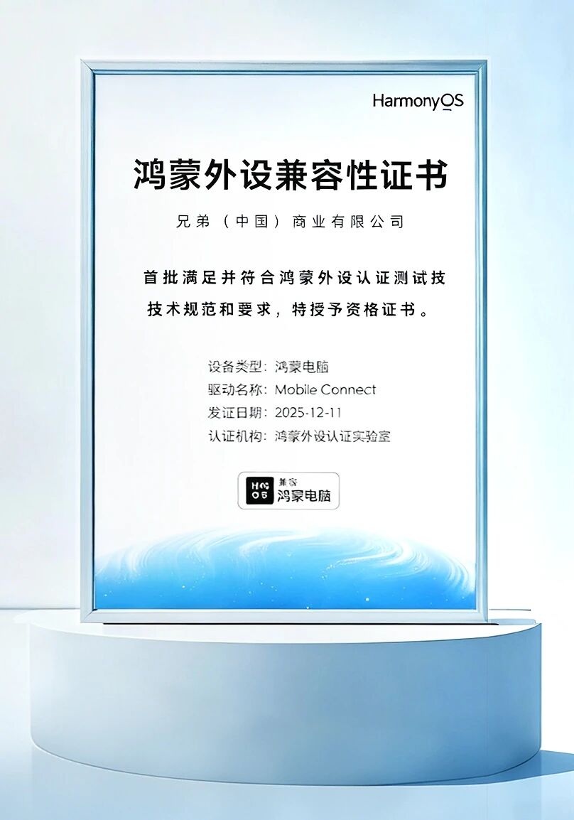 近日,兄弟(中国)商业有限公司 正式获得由鸿蒙外设认证实验室颁发的“鸿蒙外设兼容性证书”,成为首批支持鸿蒙系统的外设设备认证品牌之一。此次认证标志着Brother在融入国产操作系统生态、服务本土用户方面取得了又一重要进展。