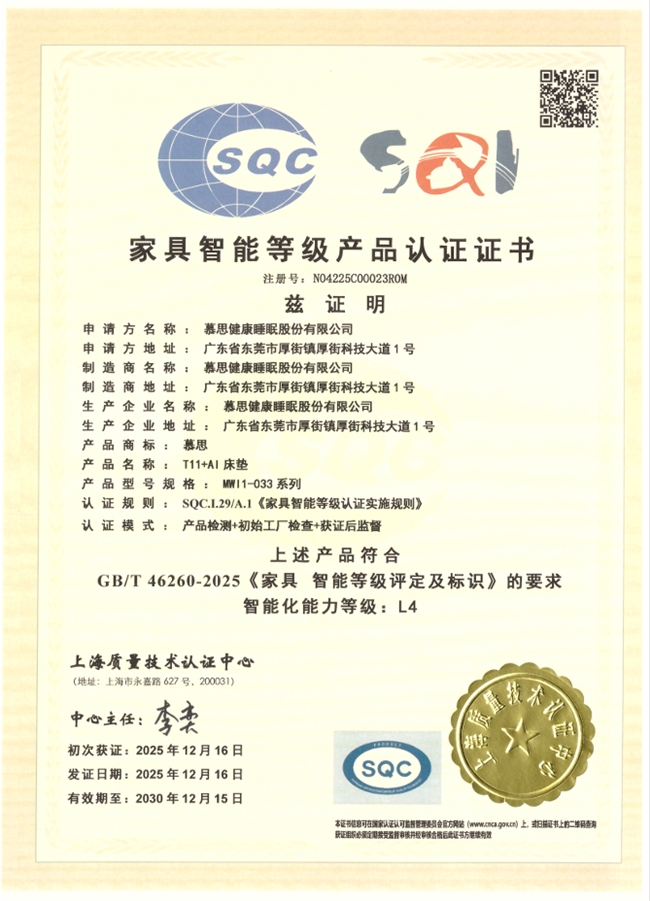 近日,慕思旗下T11+AI床垫正式通过由上海质量技术认证中心依据国家标准《家具智能等级评定及标识》(GB/T46260-2025)颁发的L4级智能床认证,成为行业内少数获得该最高等级认证的企业之一。L4级是目前国家智能家具标准中针对智能床设定的最高智能等级,代表着产品在感知、决策、执行与服务闭环上的全面领先。