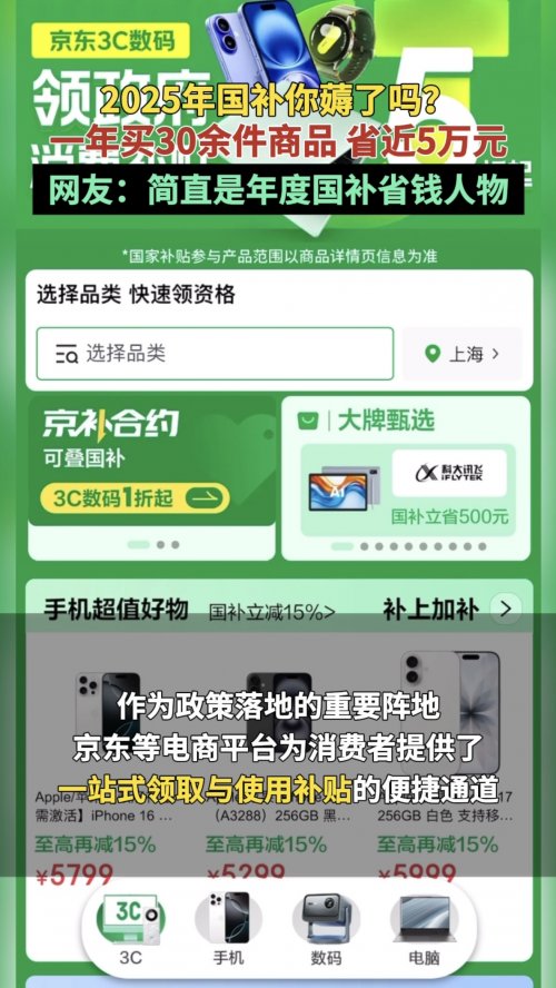 近期,一份关于国家补贴政策(以下简称“国补”)的消费趋势观察引发关注:通过梳理公开数据发现,国补政策在耐用消费品领域为消费者带来显著的支出减免。据梨视频报道,一位来自上海的消费者一年内在京东购买家电、3C数码及家装产品,在国补的支持下累计节省近5万元,相当于一辆小汽车的支出,被网友称为“年度国补省钱人物”。