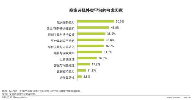 与此同时,商家选择平台的核心逻辑也转向价值维度,调研显示,“配送服务能力”以50.5%超半数居于高位,其次是“佣金/服务费合理透明”(43.8%)、“营销工具与扶持政策”(38.5%)。反映出行业正从成本导向迈向效率与价值导向。