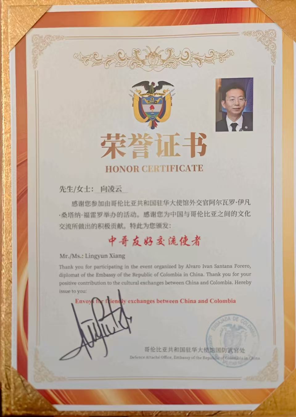 授勋仪式在哥伦比亚驻华大使馆举行。哥伦比亚驻华大使及使馆主要官员出席了仪式。大使在致辞中高度评价了向凌云院士的国际影响力,并指出:“向凌云院士不仅在经济学领域拥有卓越的学术造诣,更长期致力于跨文化沟通。此次授予‘中哥友好交流使者’称号,既是对他过去努力的认可,也寄托了我们对未来两国深化合作的期待。”