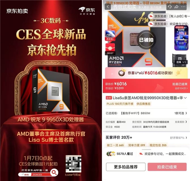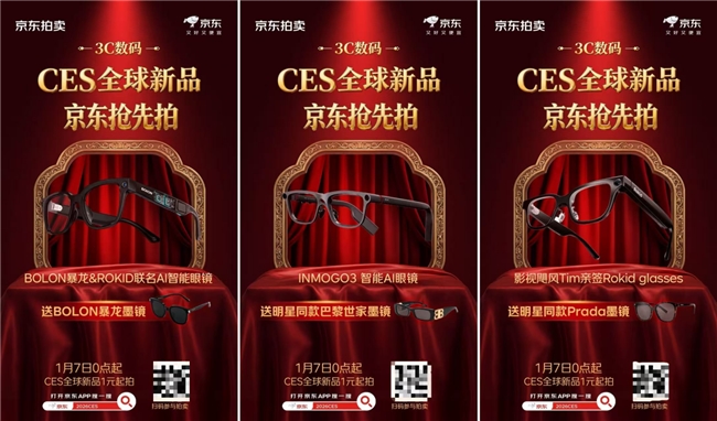 当CES的科技风暴席卷拉斯维加斯,国内的极客玩家该如何足不出户抢全球首发尖货?全球AI新品京东首发,京东发起“CES全球新品抢先拍”活动,汇聚多款全球首发AI新品与潮流好礼组合,并采用在京东拍卖“1元起拍”的方式,让科技爱好者可以第一时间体验前沿科技的魅力。目前,Lisa Su签名版AMD锐龙9 9950X3D处理器等重磅拍品已成功落槌,但精彩仍在继续。喜欢收藏与潮流科技的玩家,敬请关注1月9日上午10点开拍的AI智能眼镜专场。打开京东APP搜索“2026CES”,即可直达会场,抓住新一轮竞拍机会,将CES同款首发新品与限量潮品一并收入囊中。