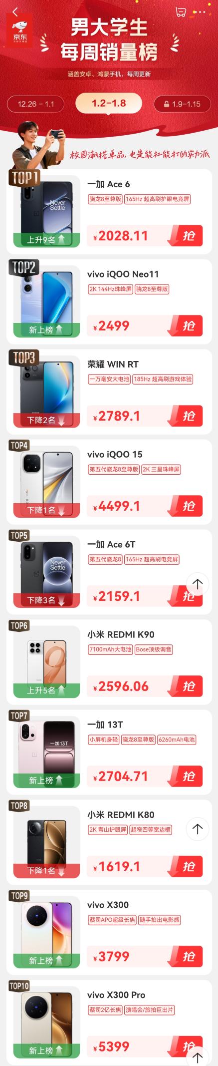1月2日至1月8日的“男大学生每周手机销量榜”TOP10依次为一加 Ace 6、iQOO Neo11、荣耀WIN RT、iQOO 15、一加 Ace 6T、REDMI K90、一加 13T、REDMI K80、vivo X300、vivo X300 Pro。其中,一加 Ace 6搭载骁龙8至尊版,配置新一代风驰游戏内核,游戏体验好;搭载电竞网络芯片G2、灵犀触控芯,配置游戏主机手柄同规格陀螺仪;内置7800mAh冰川电池,支持120W超级闪充,续航无忧。