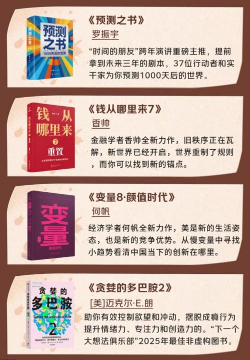 如果你希望在新的一年里洞察时代先机、优化自我认知,那么这四本聚焦趋势与心智的著作值得重点关注。罗振宇“时间的朋友”跨年演讲重磅主推的《预测之书》,集结37位行动者和实干家的前瞻思考,为你预测1000天后的世界。金融学者香帅的年度力作《钱从哪里来7》,深入剖析财富逻辑在新秩序下的演变,帮助读者寻找个人发展的新锚点。经济学者何帆在《变量8·颜值时代》中,敏锐捕捉到“美”已成为新生活姿态与新竞争优势,从慢变量中挖掘小趋势,助力读者看清中国当下的创新方向。《贪婪的多巴胺2》从神经科学角度深度拆解多巴胺与欲望、冲动的关联,帮助读者更有效地管理欲望与冲动,提升情绪掌控力与专注力。