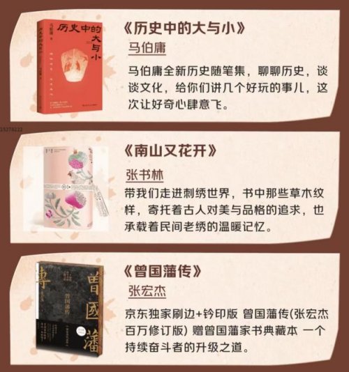 在把握时代脉搏之外,沉浸于历史的肌理、感受传统文化的魅力,也是许多读者的阅读偏爱。马伯庸全新历史随笔集《历史中的大与小》延续其“小中见大”的经典叙述风格,打捞被宏大叙事淹没的细微瞬间,让好奇心在历史长河中肆意飞扬。张书林的《南山又花开》则带领读者走进宁静深邃的刺绣世界,书中那些精美的草木纹样,不仅承载着民间老绣的温暖记忆,更寄托着古人对美与品格的永恒追求。知名历史学者张宏杰的《曾国藩传》推出京东独家刷边+钤印版,随书附赠曾国藩家书典藏本,系统解读这位晚清名臣作为“持续奋斗者”的升级之道,为现代人提供厚重的历史参照与人生智慧。