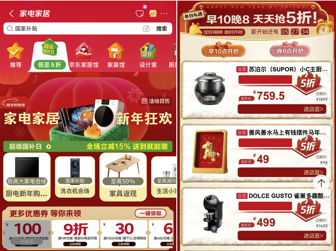 岁末迎新之际,京东家电家居超级补贴日重磅来袭,海量家电家居好物全场立减15%,还可享受“送到就能装”的省心体验,让品质生活轻松入户。1月12日20点起,打开京东APP搜索“家电家居超级补贴日”或“家电家居新年购物季”,即可一键直达活动会场,更有5折好物放送,从客厅的视听盛宴到卧室的安稳睡眠,从厨房的烹饪乐趣到浴室的焕然一新,一键打造理想中的家。