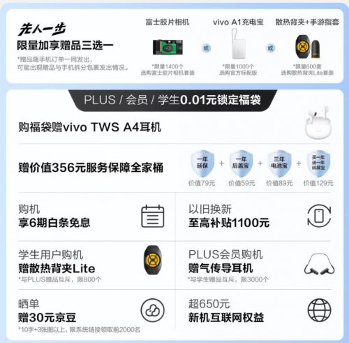 来京东预约iQOO Z11 Turbo,1元提前锁定vivo TWS A4耳机,店铺会员或京东PLUS会员或学生仅需0.01元即可锁定该权益。此外,来京东下单iQOO Z11 Turbo,还可享价值356元服务保障全家桶(含一年延保+一年后盖宝+三年电池宝+买一年送一年碎屏宝)、6期免息、以旧换新至高补贴1100元、PLUS会员限量赠气传导耳机、学生限量赠散热背夹Lite、晒单限量赠30元京豆、超650元新机互联网权益等福利。