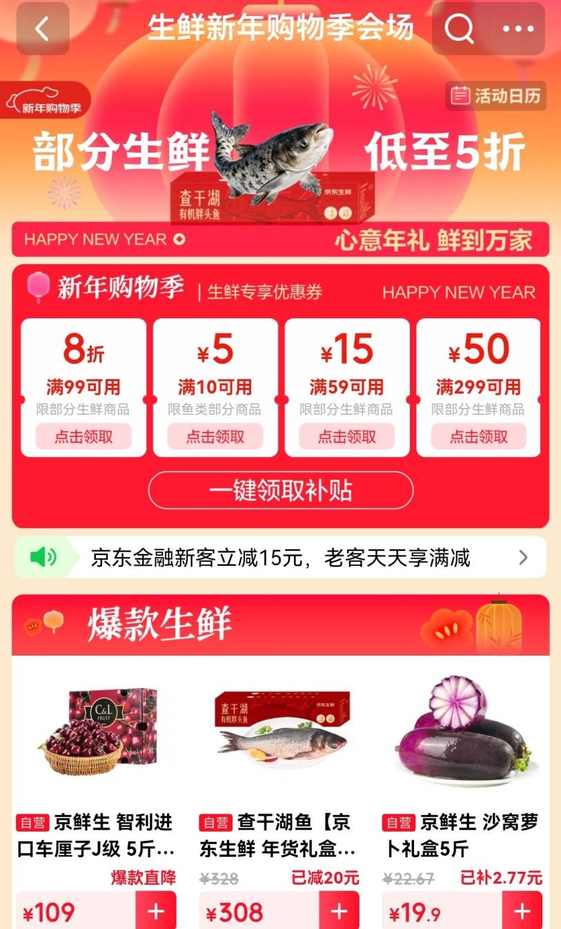 随着春节脚步临近,置办年货开始成为许多家庭的“头等大事”。1月15日晚8点,京东新年购物季生鲜主推日火热开启,围绕“送心意礼,过鲜活年”的主题,推出“满99享8折、满199打6折”等惊喜优惠,此外还可叠加“满200减20元”优惠券,多款爆款生鲜直接低至5折。此外,6J大的超级巨无霸车厘子、单条40-50斤重的查干湖冬捕有机胖头鱼、单只10斤重的澳洲特大皇帝蟹等,只需1元即可参与起拍。不仅如此,消费者下单,还有机会参与“千元生鲜年货大礼包”抽奖活动,轻松实现“年货生鲜自由”。