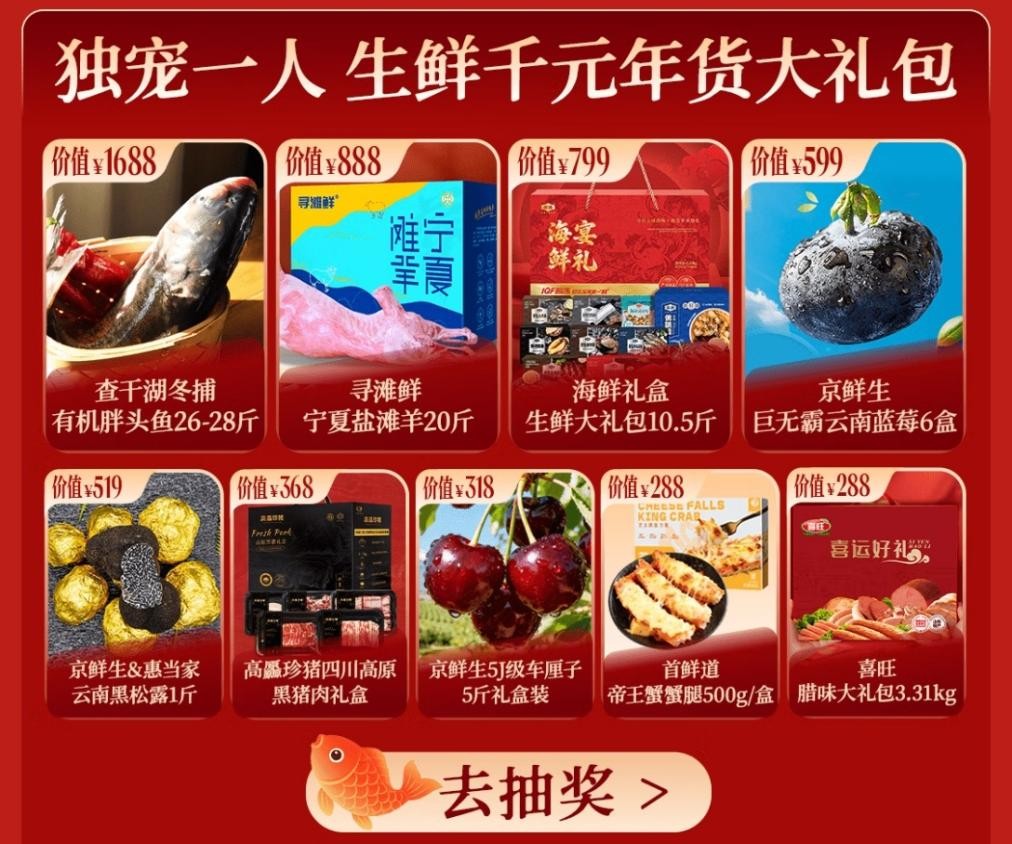 更引人注目的是,从1月12日至2月16日,京东生鲜同步启动“码上抢鲜”千元年货大礼包抽奖活动,第一波1月22日开奖,本期奖品囊括了26斤-28斤重的查干湖冬捕有机胖头鱼、20斤的宁夏盐池滩羊、10.5斤重的海鲜大礼盒、5J级车厘子礼盒,更有云南黑松露、四川高原黑猪肉、腊味大礼包等特色年货。消费者购买礼盒后,扫描礼盒腰封二维码或搜索“码上抢鲜”进入礼盒会场报名,即可参与抽奖。整个年货节期间,每周会抽取一位“年货锦鲤”,免费送上价值千元的生鲜大礼包。