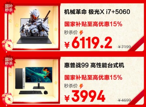 若您计划将电脑这类提升生产力与娱乐体验的“大件”列入清单,本次电脑品类的优惠同样诚意十足。堪称馈赠电竞玩家硬核之选的机械革命 极光X游戏本,秒杀价仅6119.2元;而对办公与多任务需求人群,惠普战99 高性能台式机叠加国家补贴,最高可享15%优惠,到手价低至3994元,稳定高效,轻松胜任日常工作与创作。
