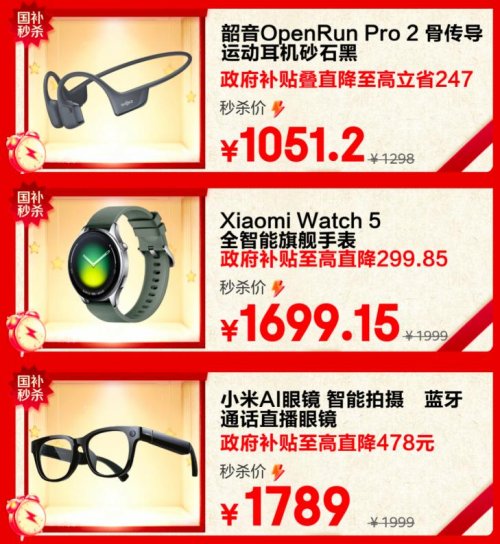 本次活动同样集结多款智能穿戴人气新品,轻松覆盖运动、健康与科技潮玩等多元生活场景。对于热爱运动的朋友,韶音 OpenRun Pro 2 骨传导耳机活动价仅1051.2元,陪伴跑步与训练更安心;若更关注日常健康管理,Xiaomi Watch 5 以1699.15元即可入手,支持全天候健康监测,宛如腕上的私人健康管家;面向热衷尝鲜的科技玩家,小米 AI 眼镜叠加政府补贴直降478元后仅需1789元,让记录生活与体验科技融为一体。。